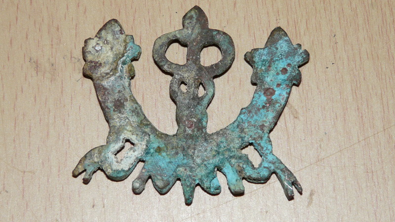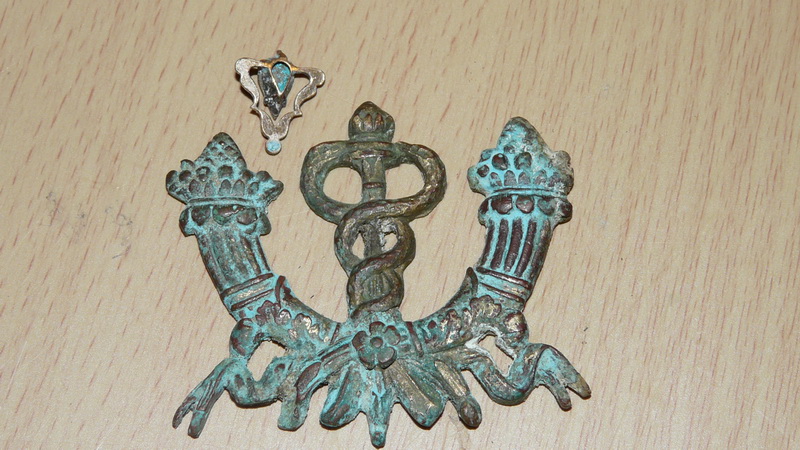9 марта скатался к одному заброшенному дому, в бывшей усадьбе. Полазил под частично разобранными полами, нашёл пару монет и вот такую накладку. Кадуцей и рожки изобилия по сторонам. Герб у Харькова с такими же символами. По инету полазил ничего похожего не нашёл. Может у кого будут мнения по сей штуке?