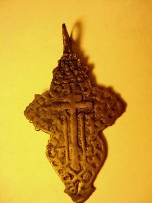 Скан нечёткий,ушко,особенно с одной стороны недаёт плотно прилеч.Но сохран оч.хороший,видны все мелкие детали,и даже текст в кресте прочесть можно.Вот крест изображен с обоих сторон,такой непопадал.Редкий ли разновид?