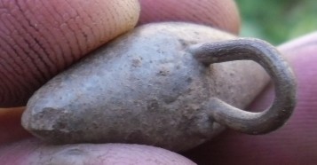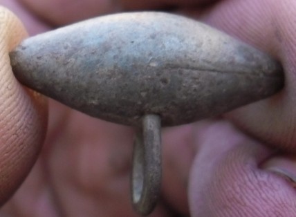 Здравствуйте всем.Попалась вот такая штучка.Похожа на пуговицу.Были такие или нет может это кустарщина?Я думал может это рыбаловный груз но речки рядом нет да и петелька большая?С ув.Владимир.
